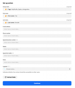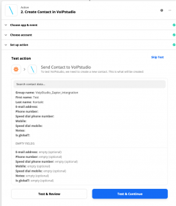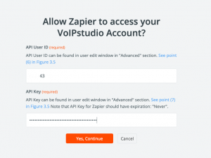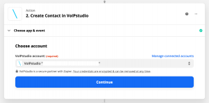 Gehen Sie bei Zapier zur zweiten Aktion, wählen Sie „Sign up in VoIPstudio“ und geben Sie die API-Benutzer-ID und den API Key ein.
