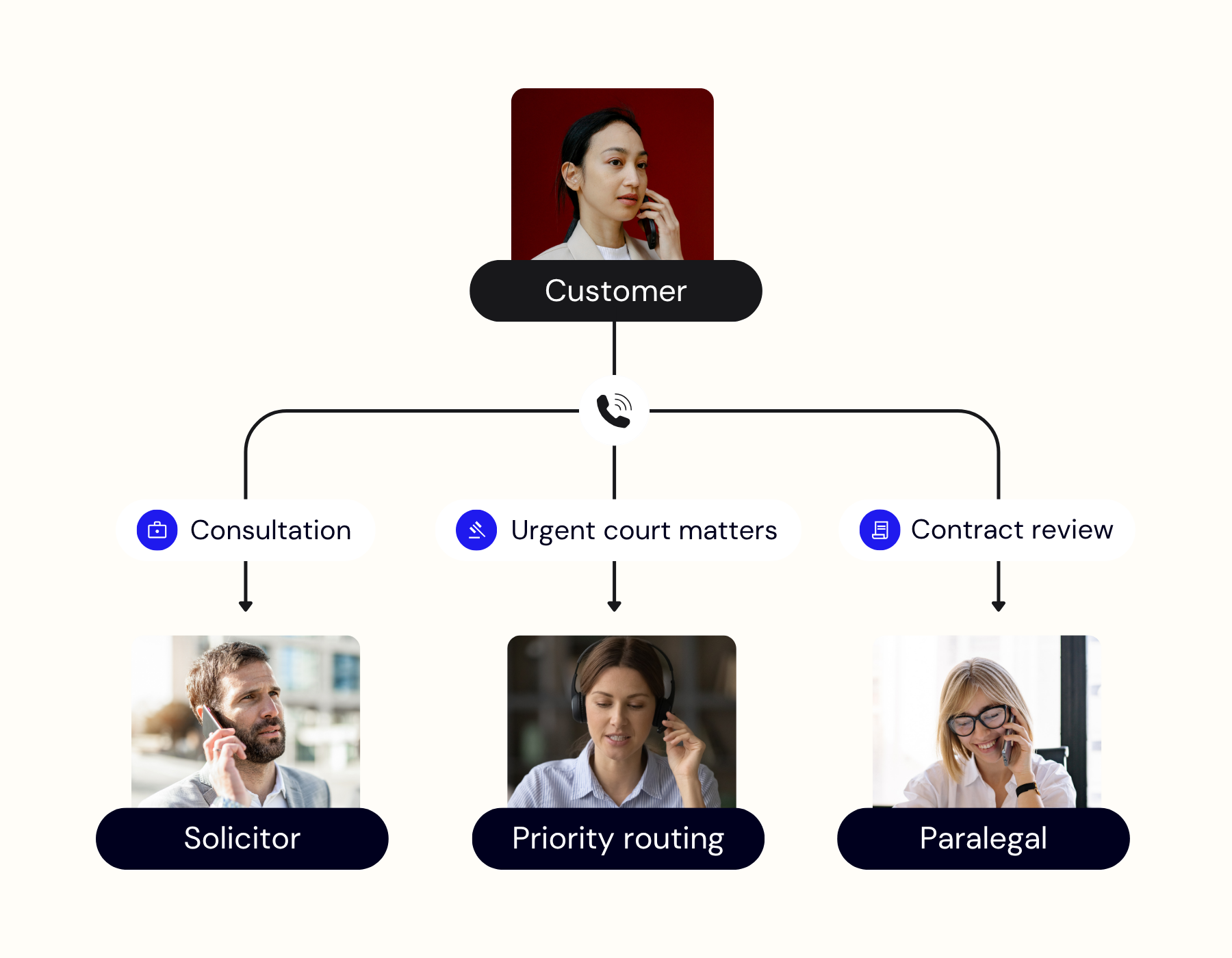 Client consultations go to solicitors, contract reviews go to paralegals, and urgent court matters get priority routing –customize your call flows in minutes.