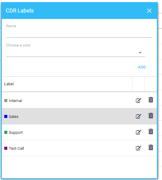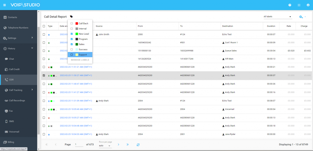 Z pulpitu administratora przejdź do Historii i przeglądaj CDR. W prawym górnym rogu okna zobaczysz listę rozwijaną etykiet. Lista rozwijana zawiera listę wszystkich bieżących etykiet i zapewnia dostęp do zarządzania sekcją Etykiety. Tam możesz edytować bieżące etykiety lub generować nowe etykiety i przypisać im kolor, aby szybko je znaleźć.