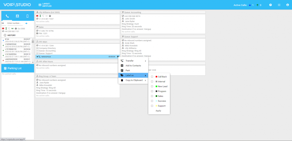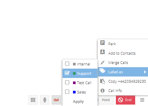 Przy jednokrotnym odebraniu lub wybieraniu połączenia, połączenie zostanie nawiązane, softphone wyświetli panel aktywnego połączenia. Stamtąd pracownicy mogą dodać jeden lub więcej tagów, gdy są na dyżurze.