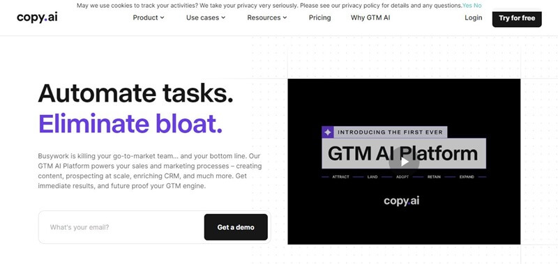 Copy.ai to platforma sztucznej inteligencji (AI), która pomaga firmom optymalizować procesy marketingowe i sprzedażowe. Wykorzystuje sztuczną inteligencję do generowania wysokiej jakości treści, znajdowania potencjalnych klientów, wzbogacania danych CRM i nie tylko.