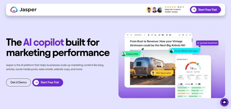 • Szybkie tworzenie treści: Jasper może szybko przygotować materiały kampanii, upewniając się, że wszystko jest zoptymalizowane pod kątem wyszukiwarek i pasuje do głosu marki.