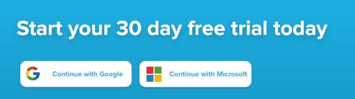 Aby to zrobić, przejdź do strony rejestracji lub kliknij przycisk „Wypróbuj przez 30 dni!” na dowolnej stronie i kliknij przyciski „Kontynuuj z Google” lub „Kontynuuj z Microsoft”. Zostaniesz przekierowany na odpowiednią stronę Google lub Microsoft.