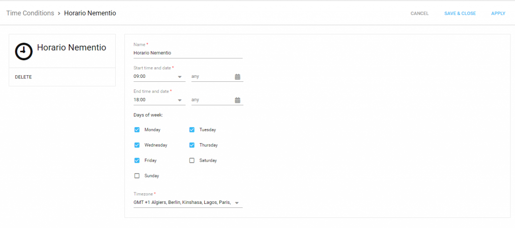 Nementio skonfigurował wiadomość: „Przepraszamy, nasze godziny pracy są od poniedziałku do piątku od 9:00 do 18:00. Jeśli chcesz się z nami skontaktować, zostaw wiadomość na poczcie głosowej po sygnale.”