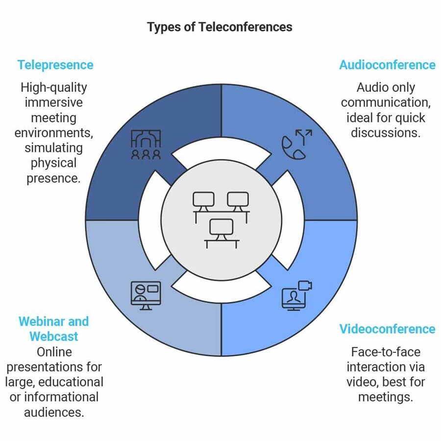 Ogólna koncepcja telekonferencji obejmuje zarówno komunikację wyłącznie audio, jak i komunikację obejmującą wideo, webinaria i inne formy wirtualnych spotkań.